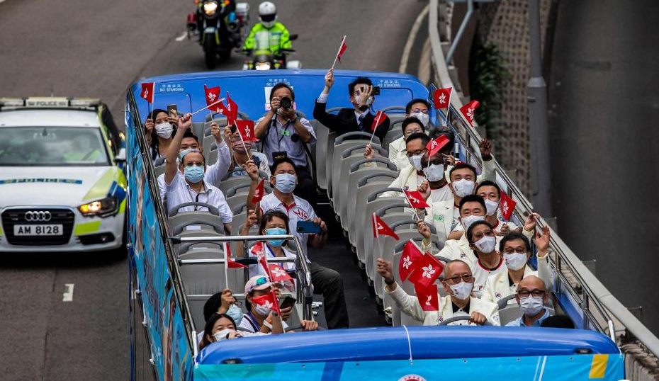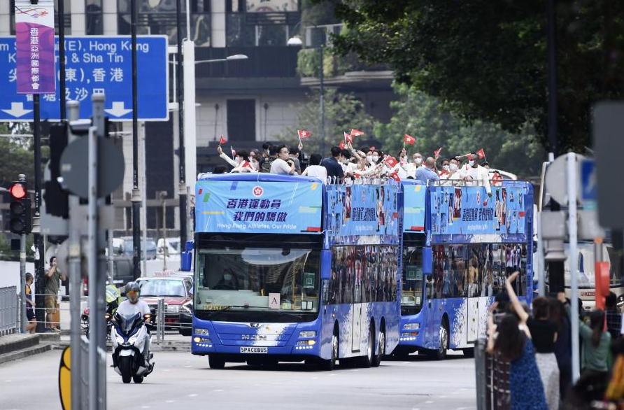 8月19日上午,香港特區(qū)政府與中國香港體育協(xié)會(huì)暨奧林匹克委員會(huì)舉行巴士巡游,慶祝東京2020奧運(yùn)會(huì)中國香港代表團(tuán)凱旋返港。