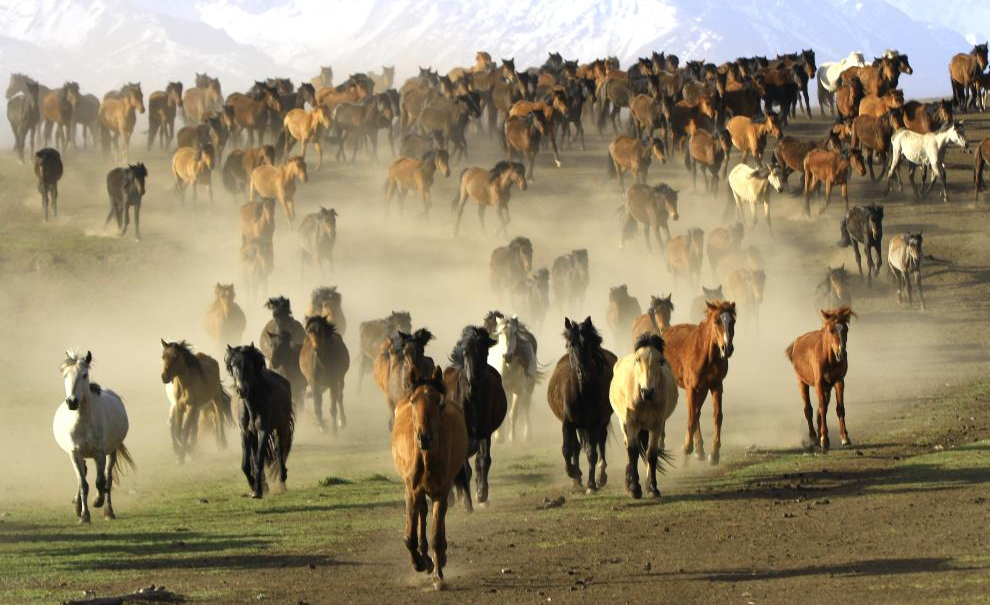 5月19日,甘肅張掖,數(shù)百匹駿馬奔馳在山丹馬場(chǎng)的草原上,牧人揚(yáng)鞭,群馬奮蹄,場(chǎng)面壯觀。