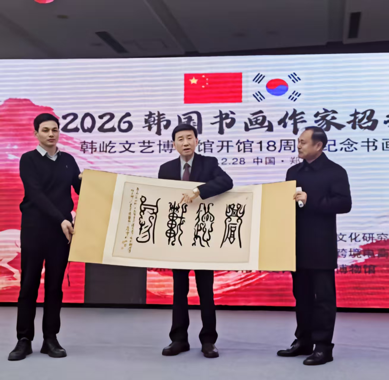 2月28日上午春雨霏霏,翰墨飄香,《2026.韓國書畫招待展》在鄭東新區(qū)藝術(shù)中心之“河南省文化館”盛大開幕;此次展覽恰逢丙午馬年正月十二,即是韓國“韓屹文藝博物館”開館18周年的特別企劃活動,也是豫韓文化交流30周年的重要舉措;來自韓國20余位書畫名家與河南各界友人百余人齊聚一堂,以墨為媒,以畫為橋,共賞藝術(shù)之美,共敘兩國情誼!