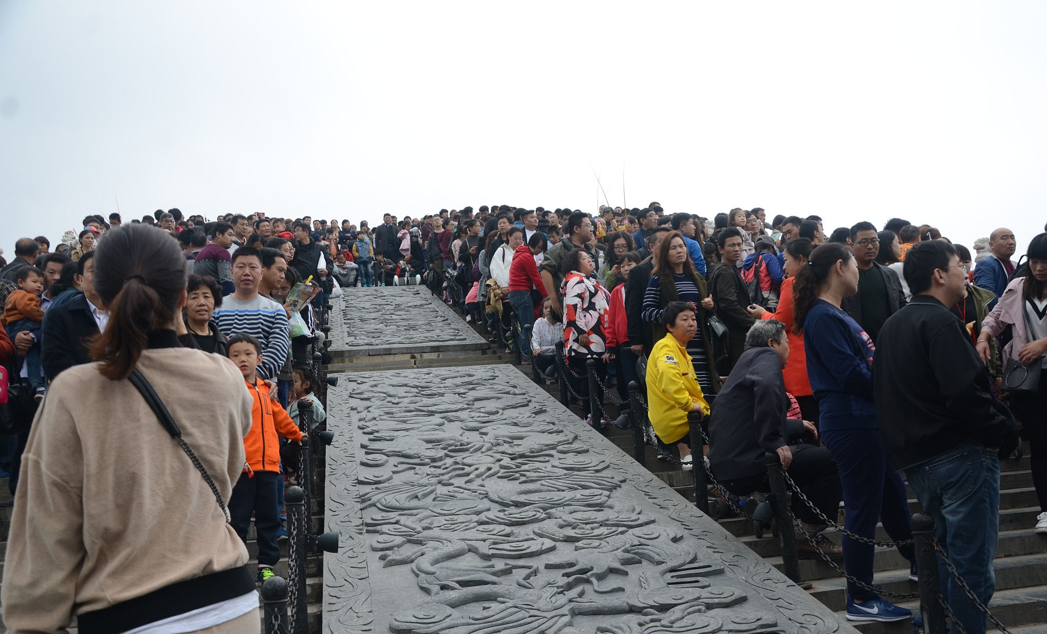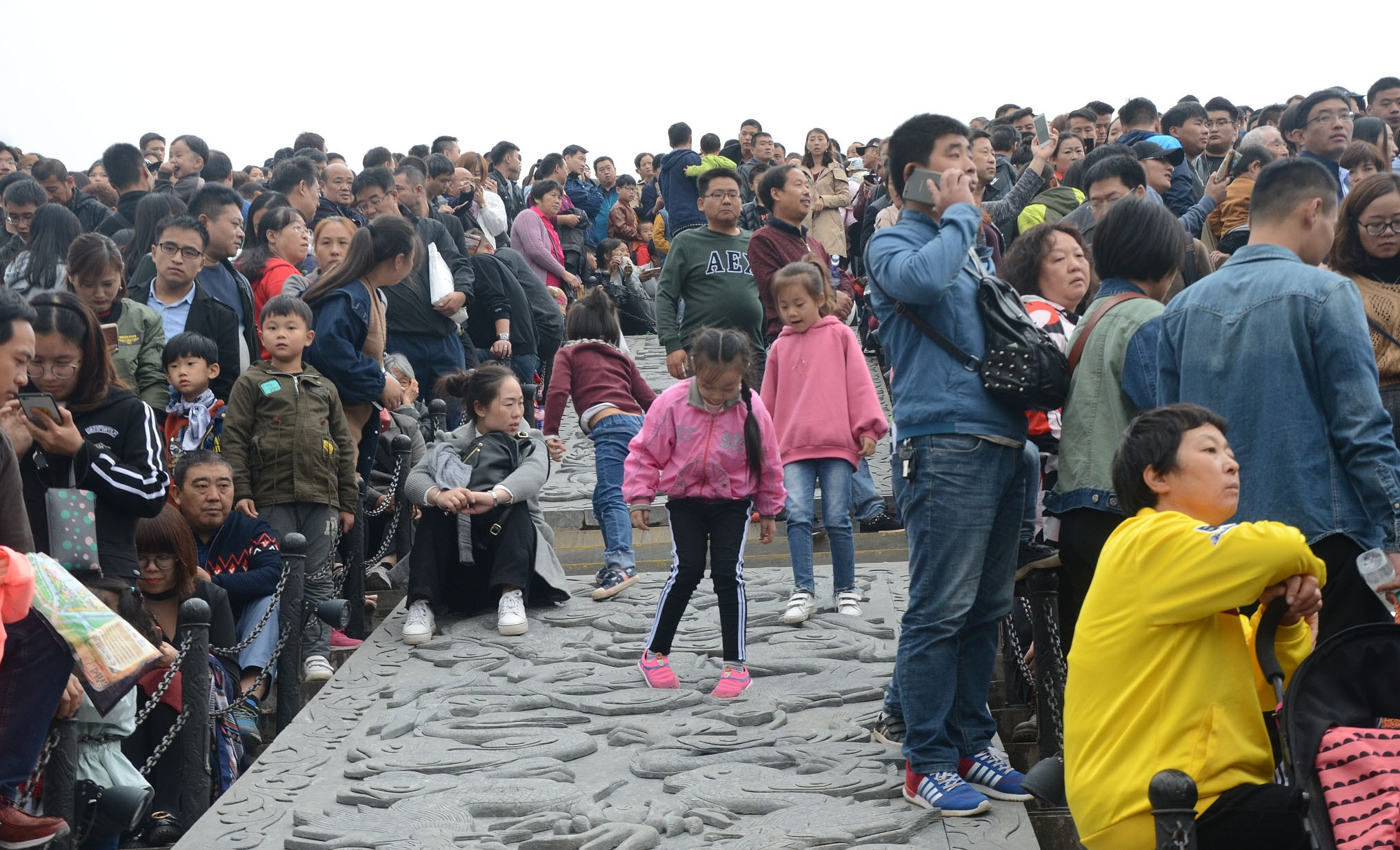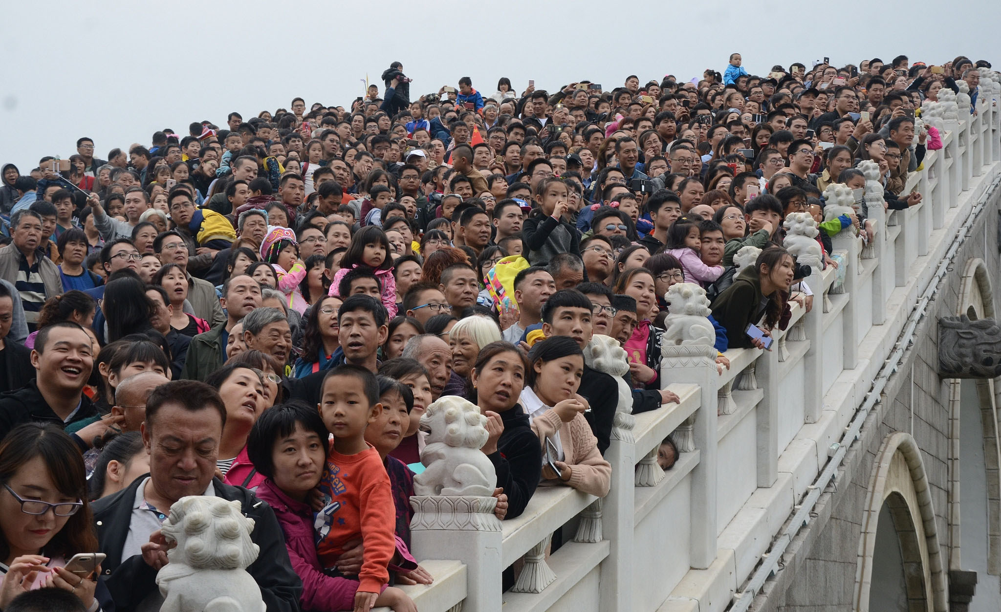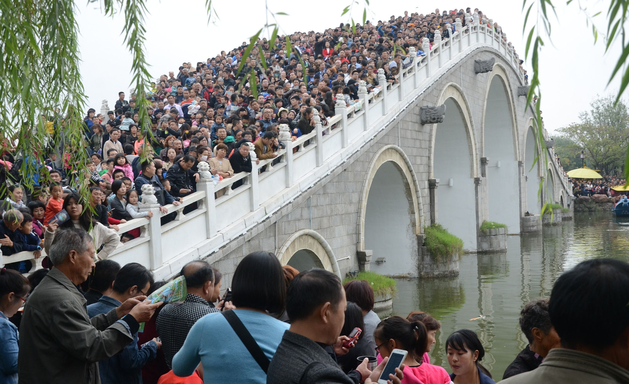 10月5日,在河南開封清明上河園,眾多游人站在橋上看演出。當日清明上河園景區(qū)人流如織,景區(qū)表演處人山人海,很多游客無奈感嘆“到哪里,看的全是人!”