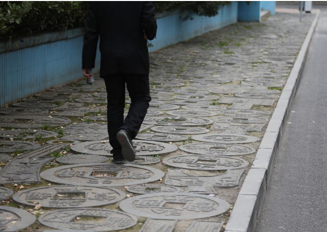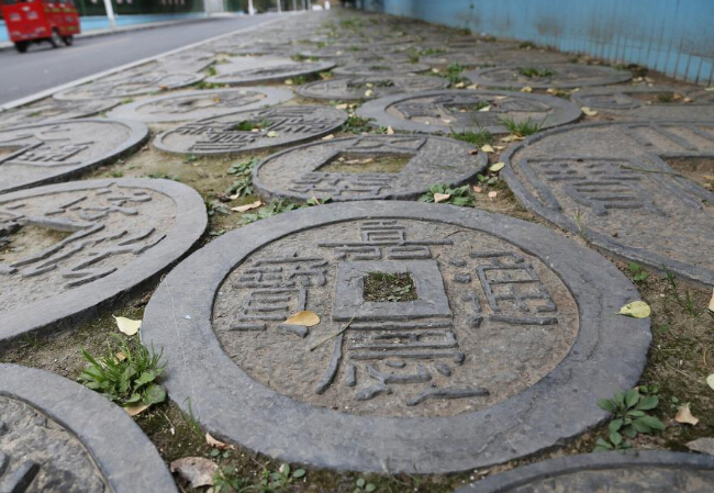 2017年11月12日,河南鄭州,趣園路一段百余米長的人行道上,鋪滿中國古代各個朝代所使用的“古貨幣”,有“嘉定元寶”、“大通宋寶”、“乾隆通寶”等,還有“刀幣”、“三孔布”等,被市民稱為最“土豪”街道。
