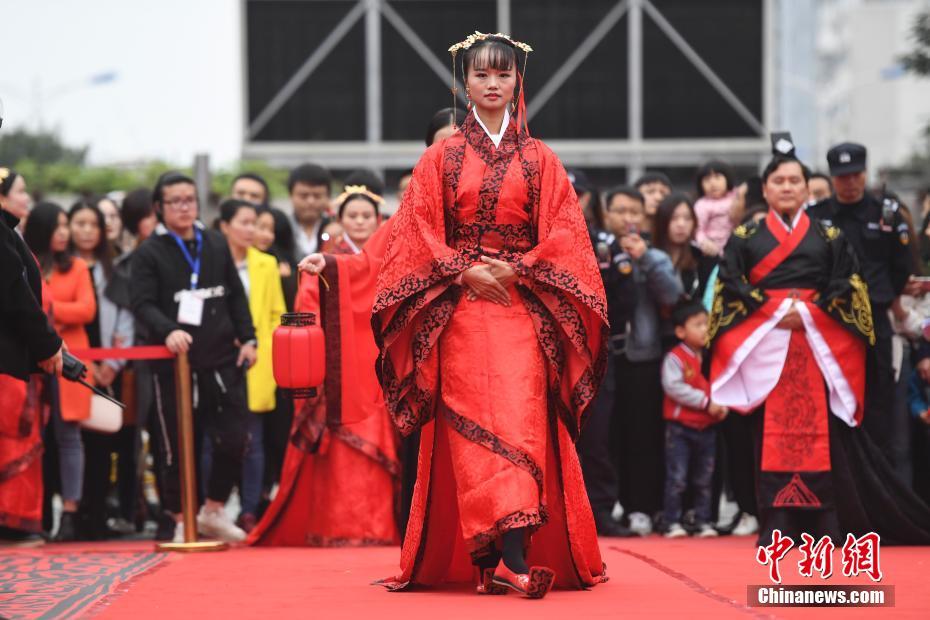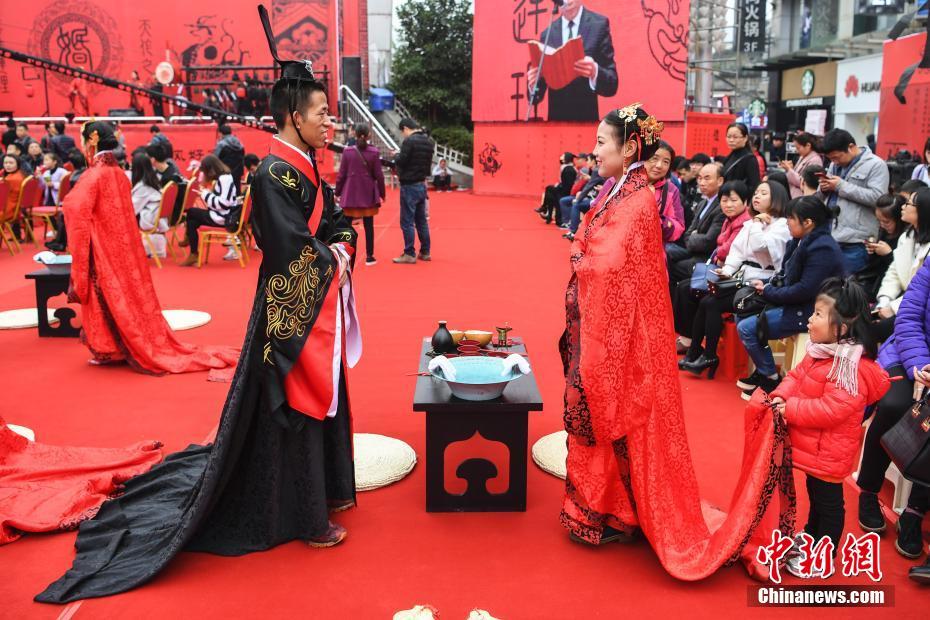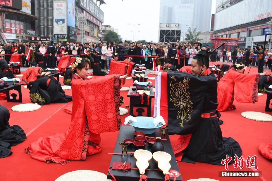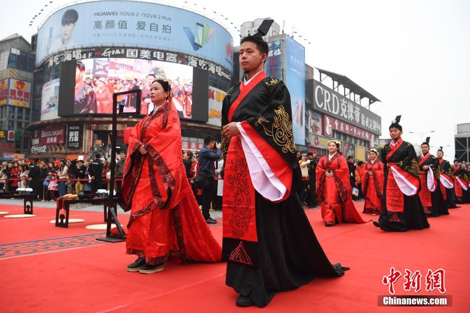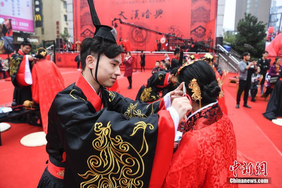 11月12日,一場復(fù)古的漢式公益集體結(jié)婚大典在湖南長沙舉行,31對新人身穿漢家衣裳,在贊禮官帶領(lǐng)下進行醮子、恭迎、沃盥、祈福、同牢等禮節(jié),將兩千年前的漢朝婚禮展現(xiàn)給眾人。