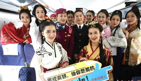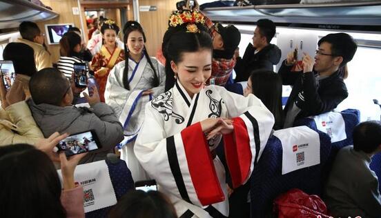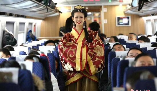 12月9日,在成都發(fā)往西安的D4252列車上,四川西南航空學(xué)院二十多名身穿漢服、芙蓉花季動(dòng)車制服的準(zhǔn)“動(dòng)妹兒”就為旅客帶來一場(chǎng)穿越之旅,吸引了眾多關(guān)注。
