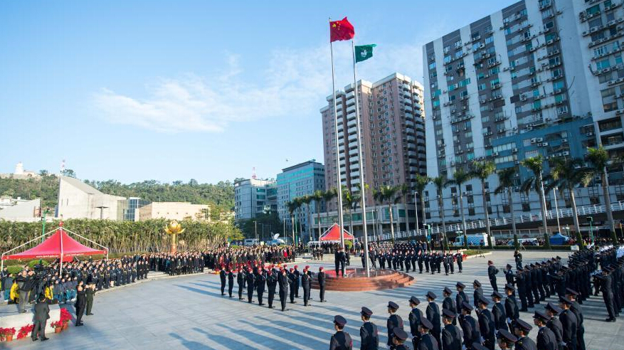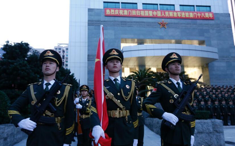 12月20日上午,駐澳門(mén)部隊(duì)在澳門(mén)新口岸營(yíng)區(qū)和珠海正嶺營(yíng)區(qū)、洪灣營(yíng)區(qū)同步隆重舉行升國(guó)旗儀式,慶祝澳門(mén)回歸祖國(guó)暨中國(guó)人民解放軍進(jìn)駐澳門(mén)18周年。圖為新口岸營(yíng)區(qū)駐軍官兵面向冉冉升起的五星紅旗莊嚴(yán)敬禮,為祖國(guó)和澳門(mén)獻(xiàn)上深深的祝福。