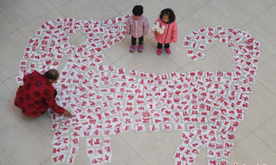 12月26日,濟南民間剪紙藝人用數(shù)百只形態(tài)各異的剪紙“狗”拼“瑞狗迎新”圖。圖為濟南67歲剪紙藝人徐建剪2018只“旺旺狗”迎新年。