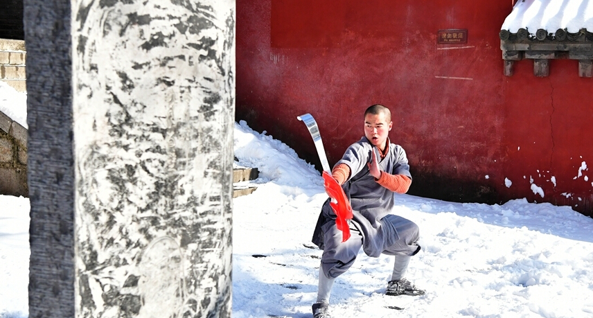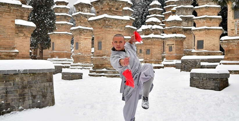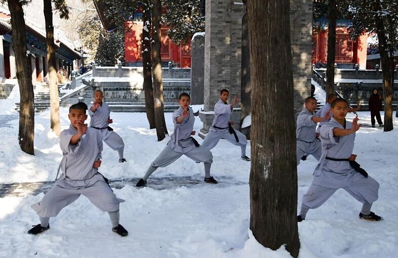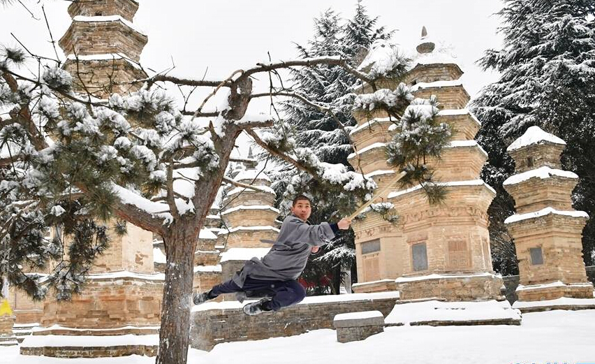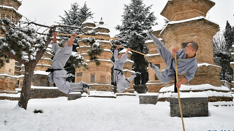 1月5日,武僧在少林寺表演少林傳統(tǒng)拳法。位于河南嵩山五乳峰下的少林寺,是中國漢傳佛教的“禪宗祖庭”和少林武術(shù)的發(fā)源地。連日來的大雪讓少林披上了一層銀裝,武僧們在雪地中演練武術(shù),一展絕技。
