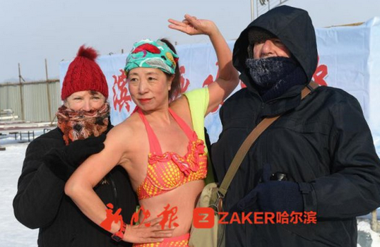 她早已把冬泳池四周當(dāng)成了她的T臺(tái)秀場(chǎng),對(duì)向自己投來(lái)的驚異目光的人,她會(huì)主動(dòng)與之握手,用微笑和禮貎的問(wèn)侯回敬?吹酵鈬(guó)友人她還用英語(yǔ)或俄語(yǔ)向他們問(wèn)好。在她的帶動(dòng)下,冬泳場(chǎng)沸騰了,游客爭(zhēng)相與她一起互動(dòng)、拍照、歡呼,甚至有游客為了跟她貼身拍照偷溜進(jìn)內(nèi)場(chǎng)。她一會(huì)兒坐在冬泳池旁的冰墩上,一會(huì)爬到江面的雪堆上讓游客盡情地拍照。爬冰臥雪,一拍就是半個(gè)多小時(shí)!