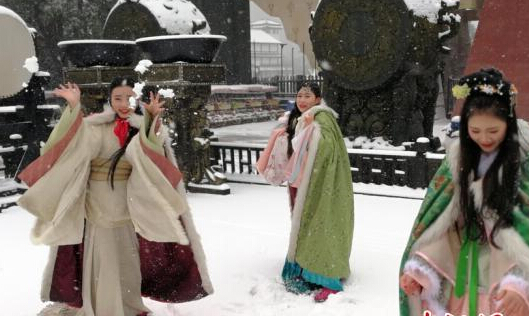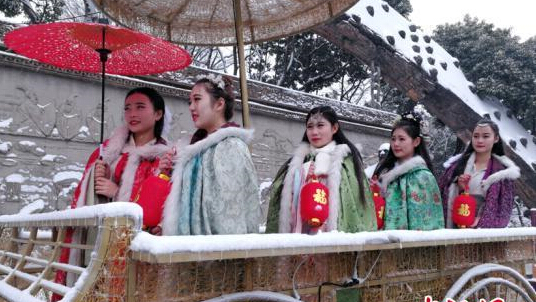 1月25日,在漫天飄飛的寒雪之中,常州春秋淹城遺址上,一群古裝美女踏雪而來(lái),為白雪掩映之下的常州淹城帶來(lái)點(diǎn)點(diǎn)亮色。