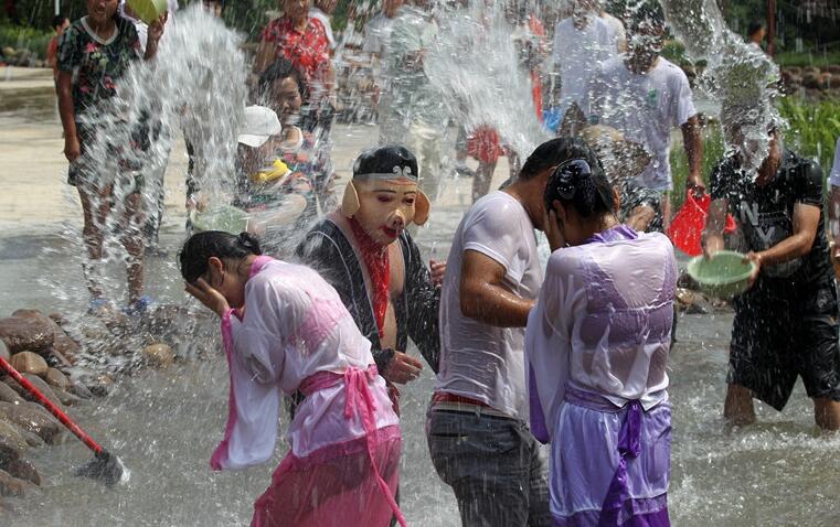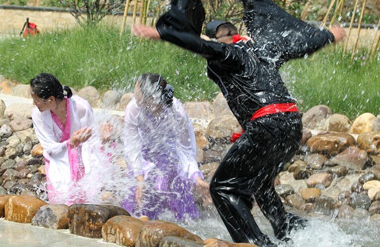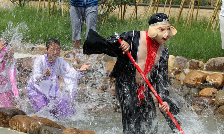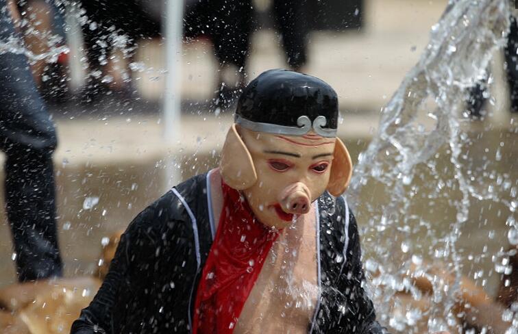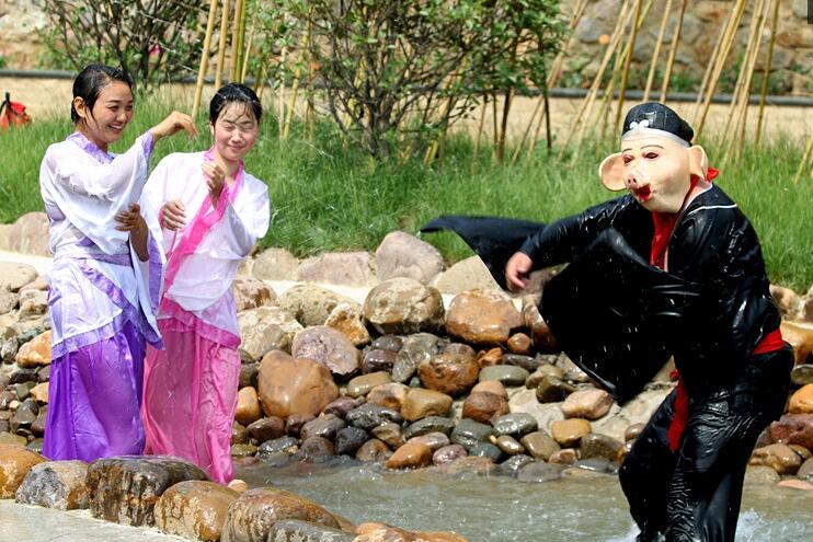 近日,在河南許昌,在禹州市大鴻寨景區(qū)戲水狂歡潑水節(jié)上,除了開幕式眾多精彩表演節(jié)目外,大鴻寨潑水季還安排有激戰(zhàn)水簾亭、穿越瓜果河、情歌連珠泡、七彩嘯天泉等多項(xiàng)活動(dòng)。“天蓬花帥”豬八戒戲水仙女樂翻天。