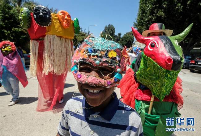 6月24日,在美國(guó)洛杉磯,一名男子戴著面具參加面具節(jié)游行。當(dāng)日,美國(guó)洛杉磯舉行面具節(jié),傳統(tǒng)藝術(shù)家、青年團(tuán)體等通過(guò)面具制作、舞蹈、音樂(lè)表演和游行等表達(dá)對(duì)祖先和傳統(tǒng)的敬意。