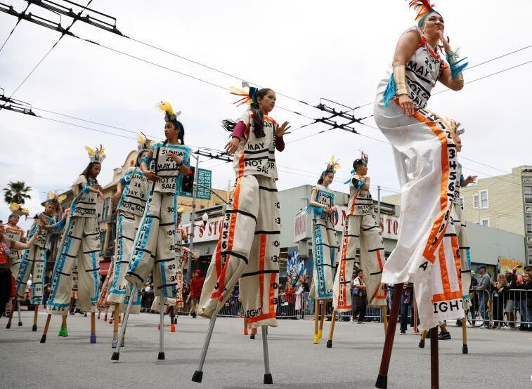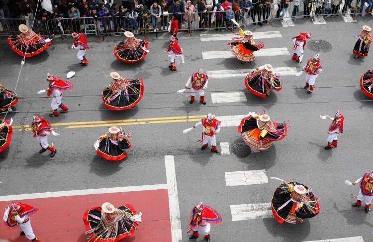5月26日,舊金山民眾聚集在米慎區(qū)歡度嘉年華。舊金山嘉年華在每年5月的最后一個星期日舉行,參加表演的民眾盛裝出席,向觀眾展示代表自己族裔的歌舞。
