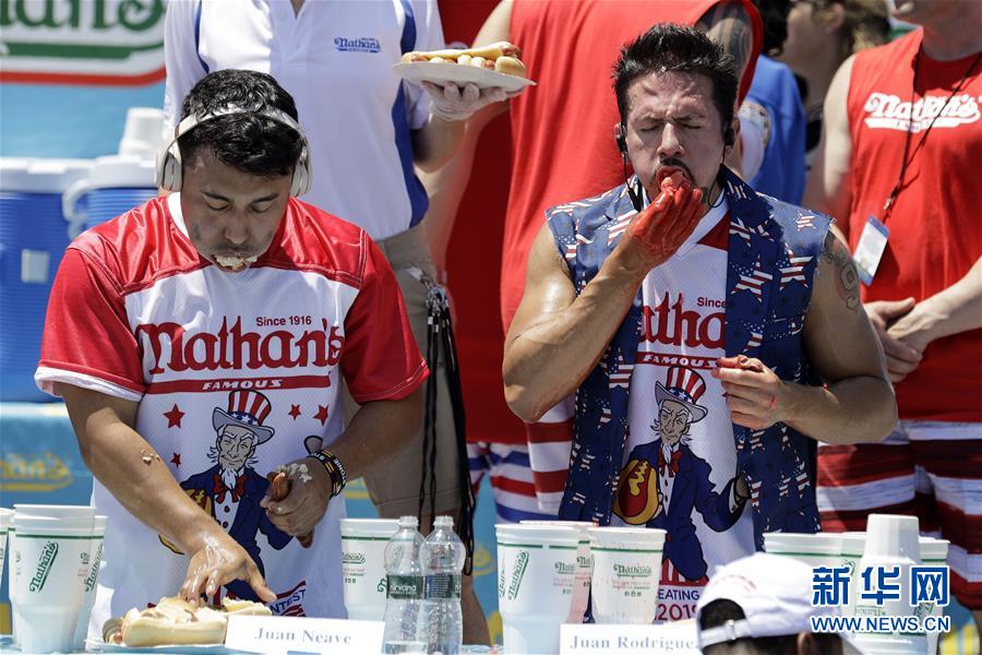 7月4日,在美國紐約康尼島,人們觀看吃熱狗大賽。 當(dāng)日,美國紐約康尼島舉行一年一度的吃熱狗大賽。在男子組比賽中,來自加州的喬伊·切斯特納特10分鐘內(nèi)吃下71個熱狗衛(wèi)冕成功。在女子組比賽中,三木須藤10分鐘內(nèi)吃下31個熱狗,連續(xù)第六次贏得冠軍。