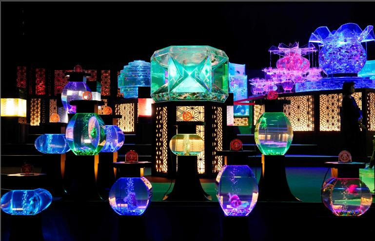 2019年7月4日,日本東京,Art Aquarium 2019 金魚藝術(shù)展舉行,身穿夏季和服的女孩們?cè)诶_紛的光影中觀賞一萬(wàn)多條五彩的金魚。