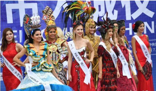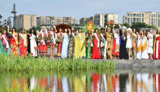 7月19日下午,2019國際友誼小姐花車巡游盛裝入城儀式在成都市雙流區(qū)拉開帷幕。來自世界60余個國家與地區(qū)的佳麗身著各國盛裝,乘坐電動公交車巡游,走紅毯秀,盡展曼妙身姿,為成都市民帶來一場視覺盛宴。圖為國際友誼小姐盛裝斗艷。