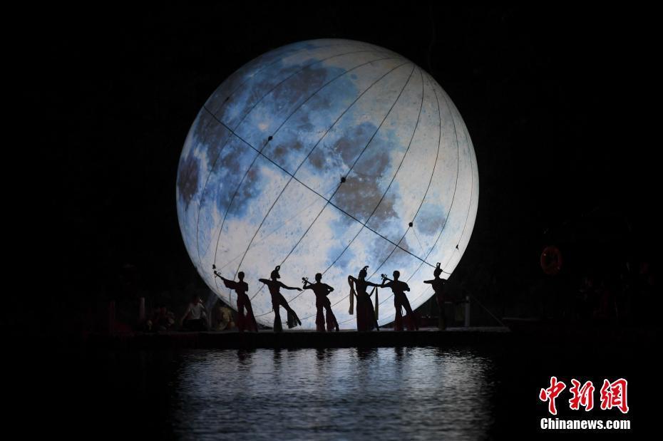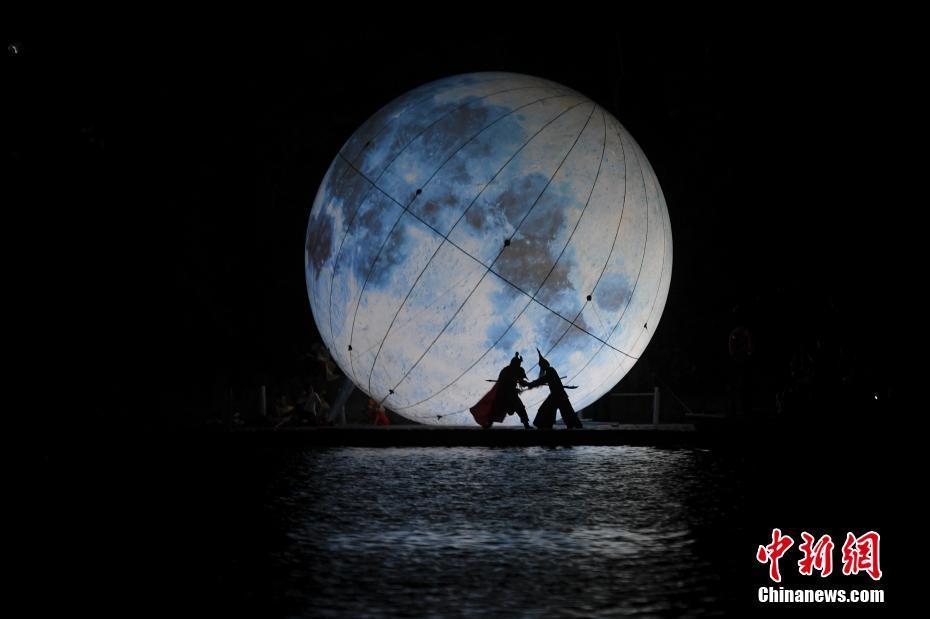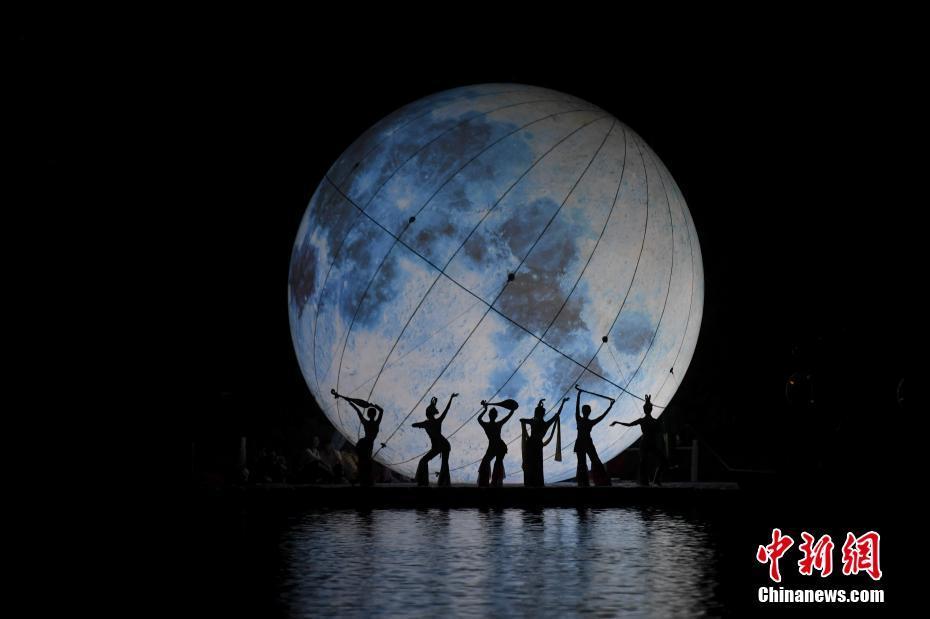 9月10日晚,一場創(chuàng)意的湖面月亮“剪影秀”在長沙石燕湖上演,眾多表演者在直徑3米的巨型月亮模型前翩翩起舞,并演繹舞臺劇中古代戰(zhàn)爭的打斗場面,以此讓觀眾感受中秋節(jié)日的氣氛。圖為舞者在湖面的巨型月亮前翩翩起舞。