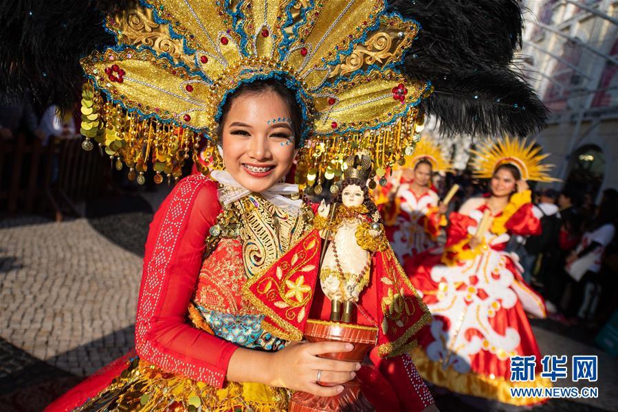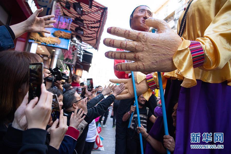 12月8日,表演者在“2019澳門國(guó)際幻彩大巡游”活動(dòng)上與觀眾互動(dòng)。 當(dāng)日,慶祝澳門回歸祖國(guó)二十周年“2019澳門國(guó)際幻彩大巡游”舉行。