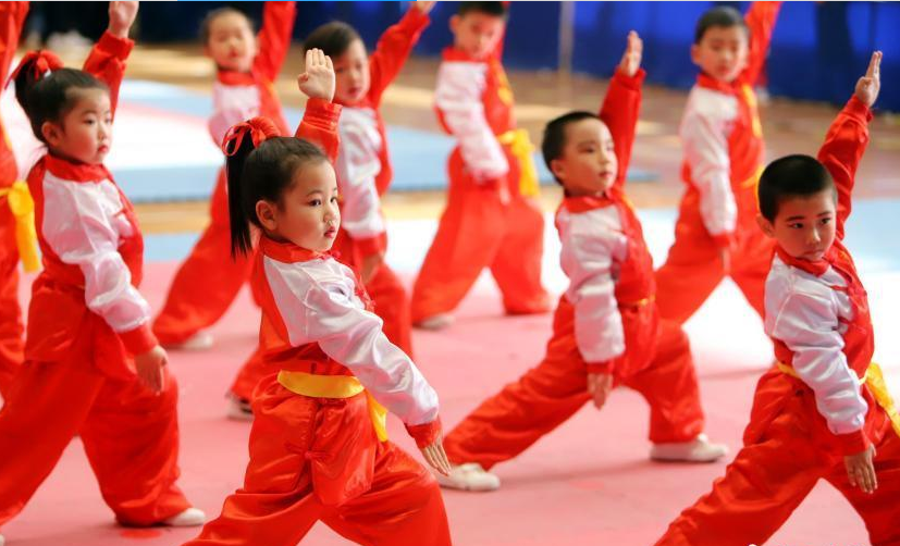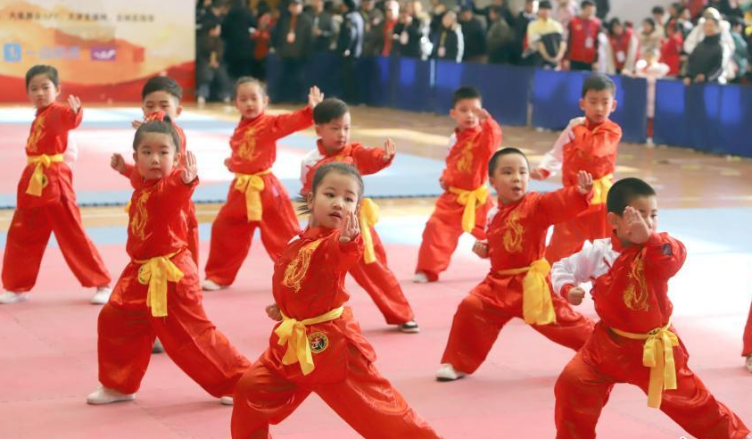12月14日,天津市第四屆幼兒武術運動大會暨天津北辰大運河武學文化交流大會在天津市四十七中體育館開幕,近千名兒童參加此次大會。圖為武術招數(shù)有模有樣的“萌娃”。