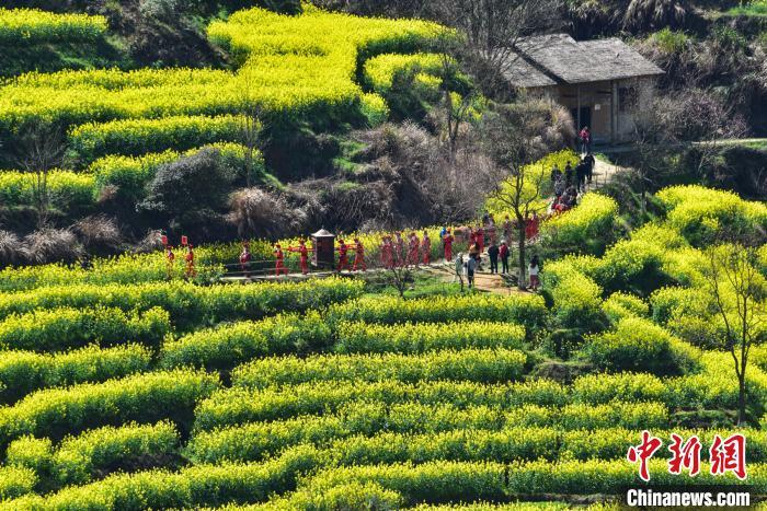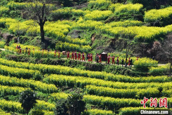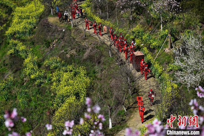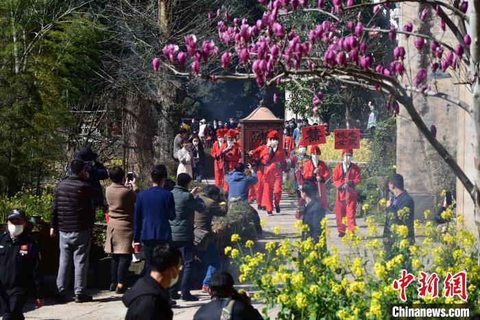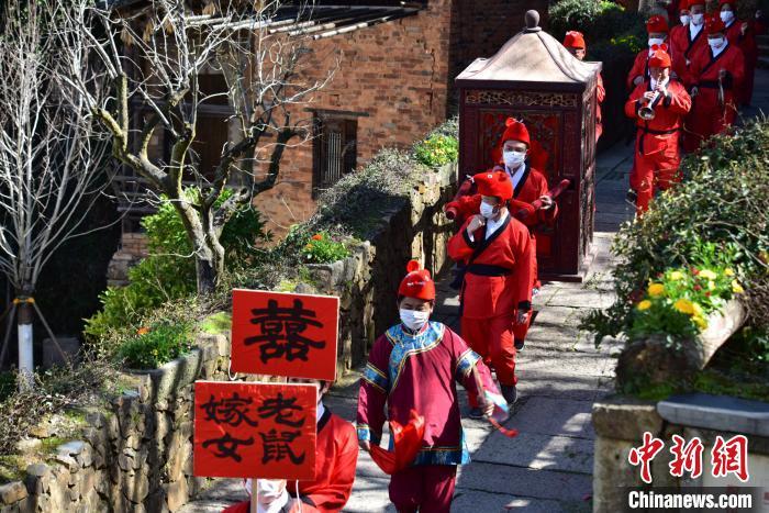 3月15日,儀仗隊(duì)22人頭戴“老鼠帽”,臉戴畫著“老鼠胡須”的口罩集合出發(fā),村民們扛著花轎、油缸、米甕、籮筐、鼠窩等“嫁妝”,將“老鼠”從村落“遣嫁”到村外。