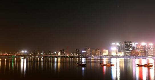 杭州錢江新城夜景在錢塘江面形成絢麗倒影。