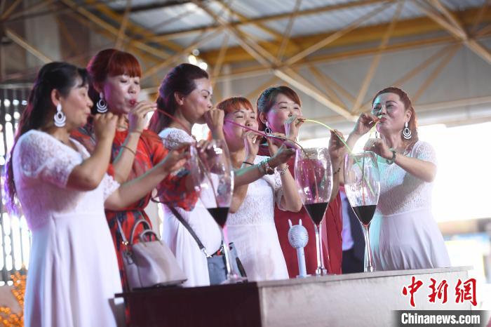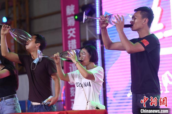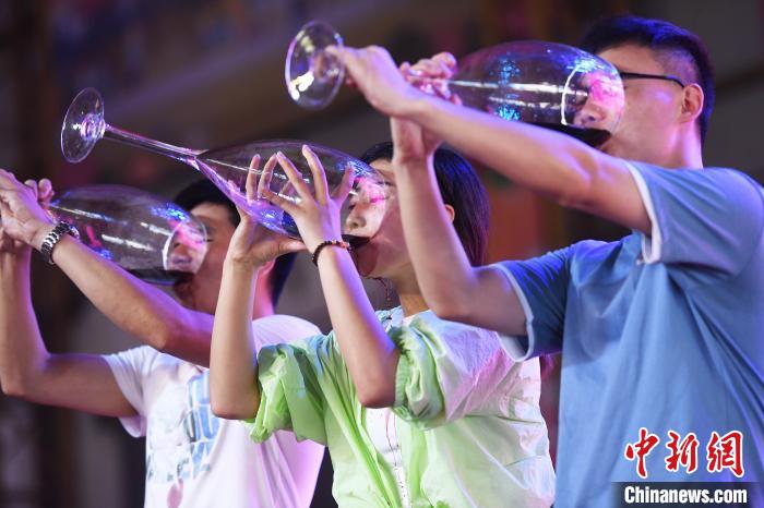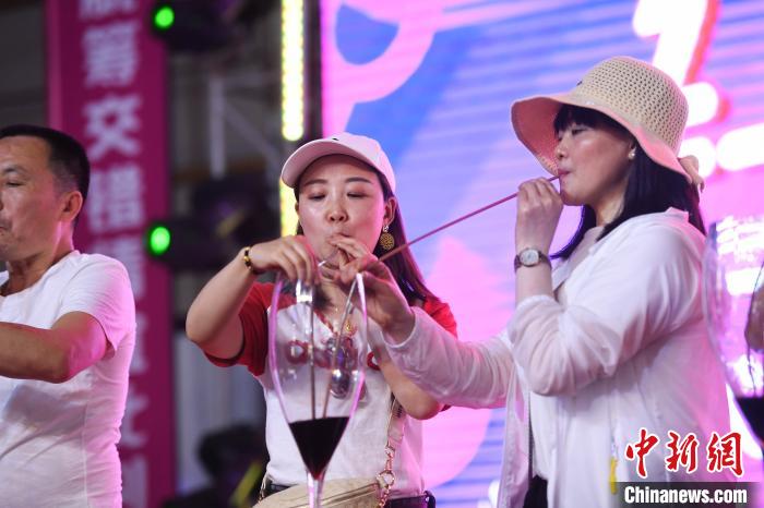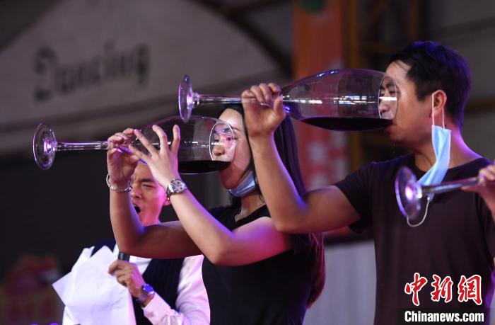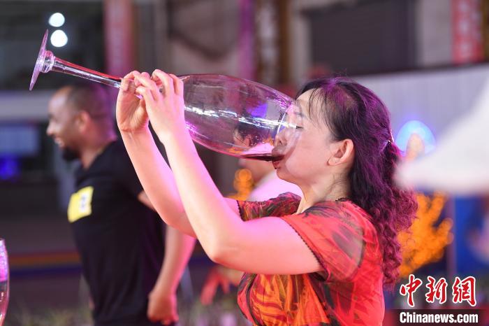 民眾拿起巨型酒杯進(jìn)行喝紅酒比賽。
