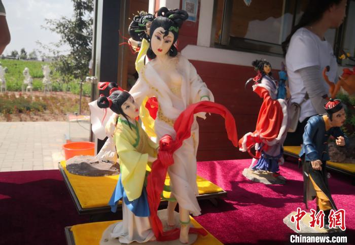 面塑孩童敲鑼打鼓場景,生動逼真。 劉玉桃 攝 美女起舞、孩童玩耍、白胡子老爺爺搖扇休息……甘肅白銀一鄉(xiāng)村旅游景區(qū),“90后”李思瑤現(xiàn)場捏面塑,人物、花鳥魚蟲等作品栩栩如生,造型多變,吸引游客觀賞購買。