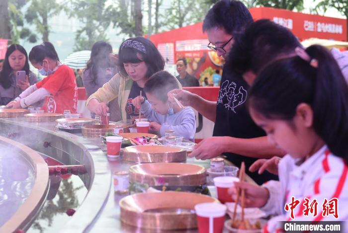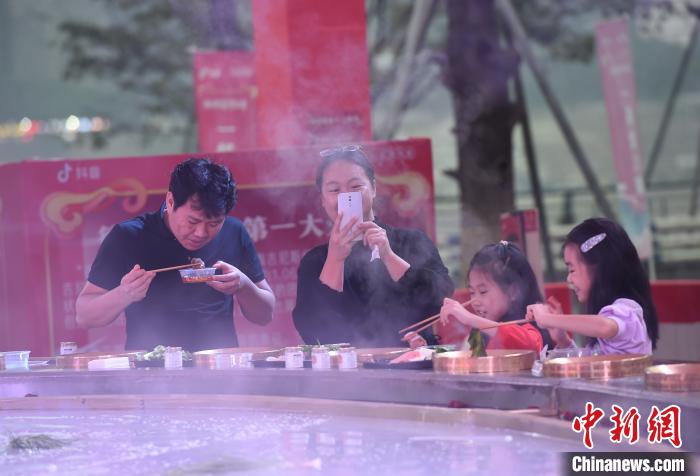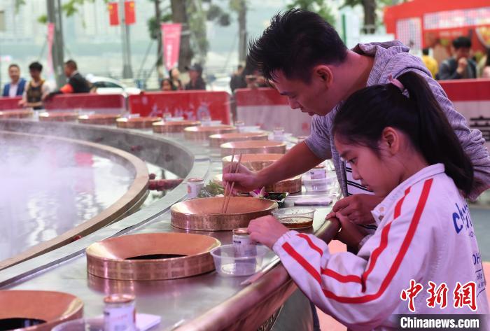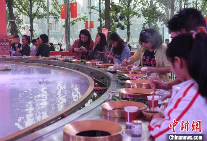10月2日,不少游客在重慶南濱路1891廣場(chǎng)品嘗“天下第一大火鍋”!笆弧奔倨冢疤煜碌谝淮蠡疱仭绷料嘀貞c街頭,大火鍋中間被分為清湯和紅湯,猶如八卦圖。據(jù)悉,該大火鍋本可同時(shí)容納50余人一起燙火鍋,但為了食客能夠保持安全社交距離,前往嘗鮮的食客便被安排分開就座。