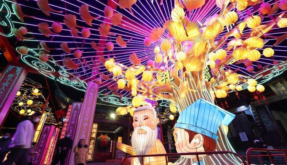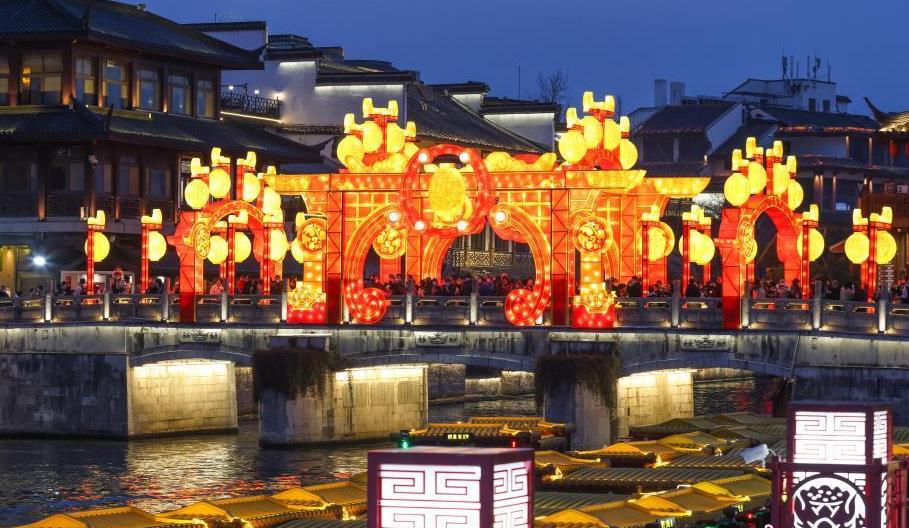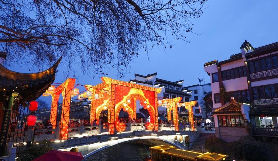 2月15日晚,民眾在南京秦淮河文德橋上賞燈。春節(jié)假期,南京秦淮河畔白鷺洲公園、夫子廟等處彩燈璀璨。